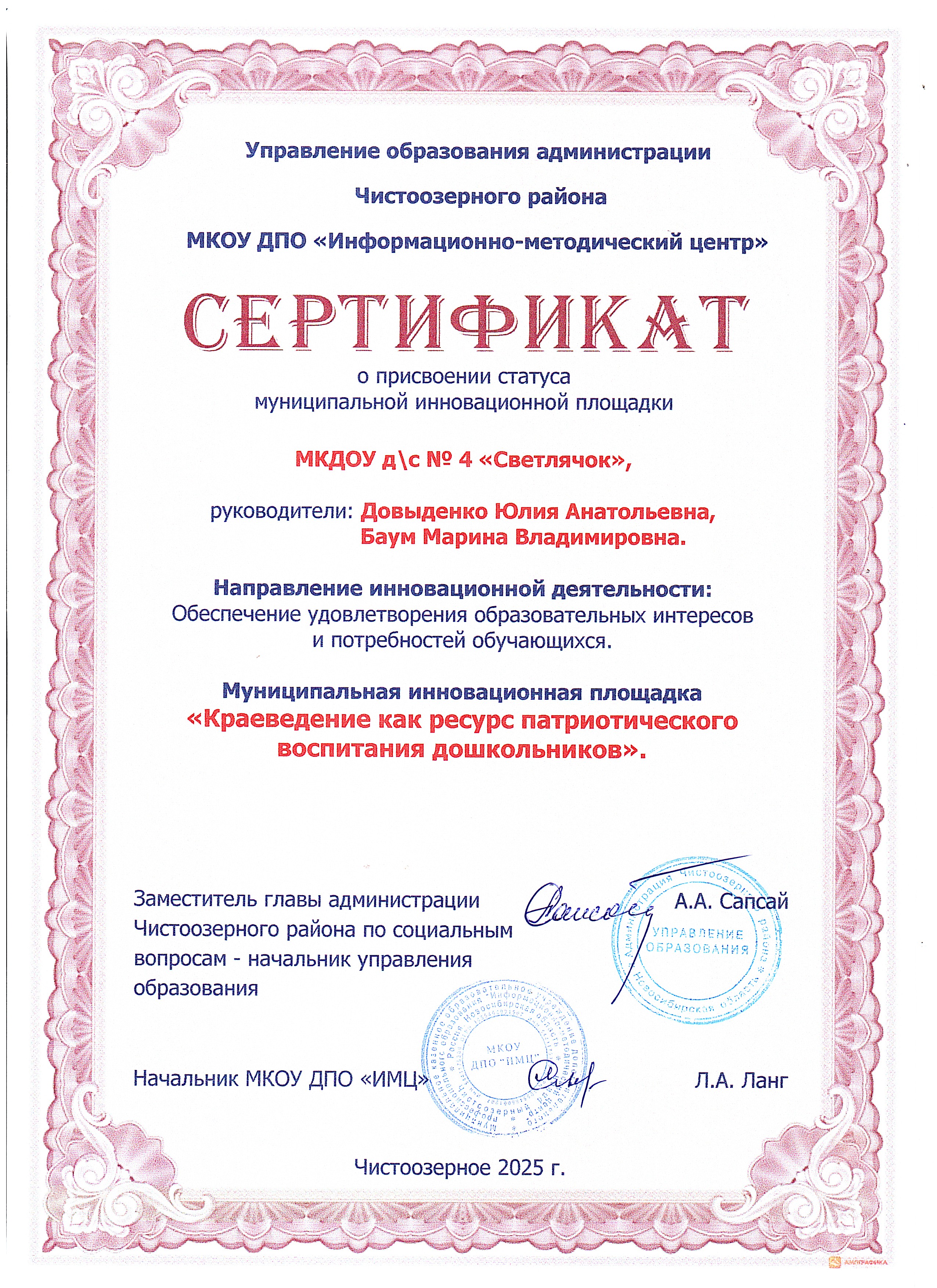 Сертификат муниципальной инновационной площадки "Краеведение как ресурс патриотического воспитания дошкольников"